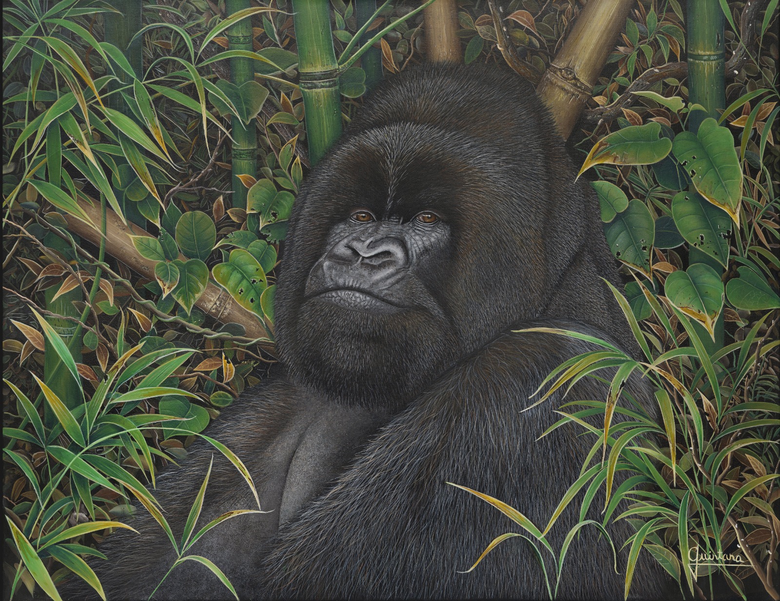 La mirada del gorila sostiene un territorio emocional profundo: firme, atento, ancestral.